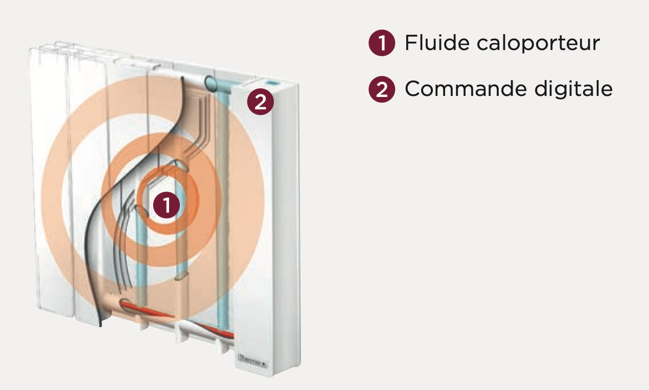 - Fluide caloporteur pour une chaleur douce, régulière et permanente.