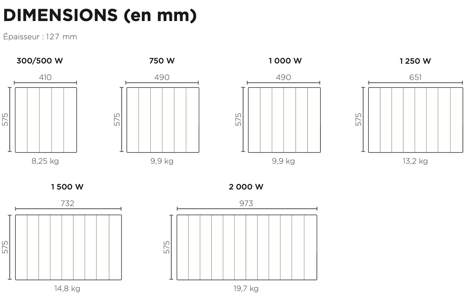 - Les versions 300W et 500W mesurent seulement 41 cm de largeur et sont ainsi idéales si vous n’avez que peu de place pour votre radiateur électrique chaleur douce.
