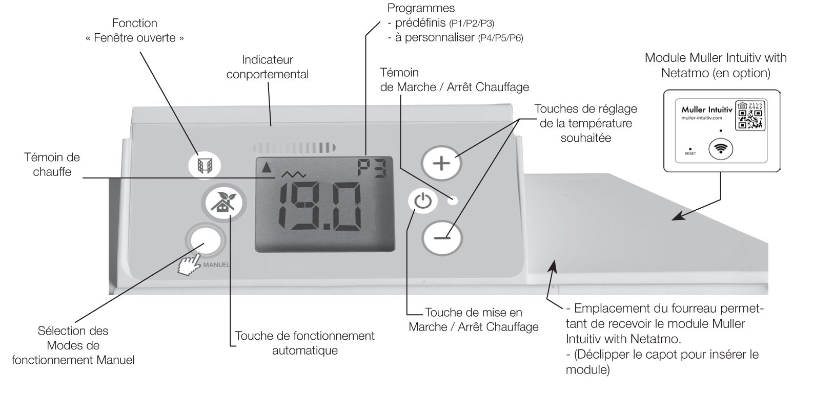 - Doté de l’intelligence MULLER INTUITIV: prend en compte le rythme de vie et adapte la température pour allier bien-être et économie.