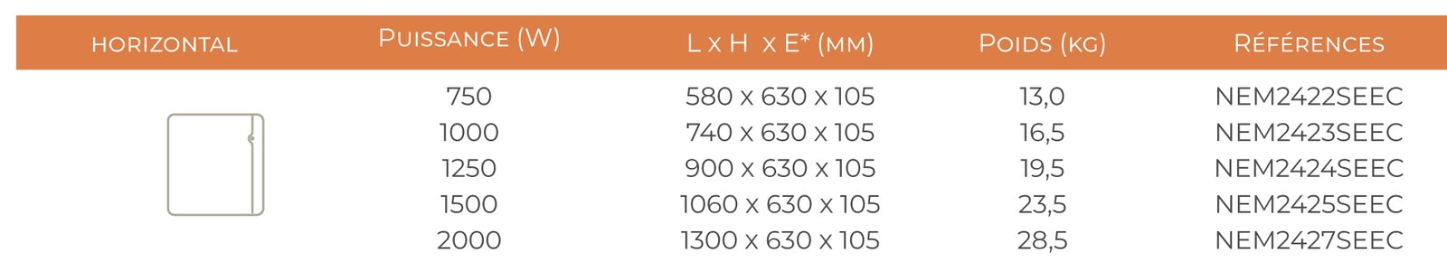 - Radiateur ETIC Slim existe en puissances 750W, 1000W, 1250W, 1500W, 2000W.