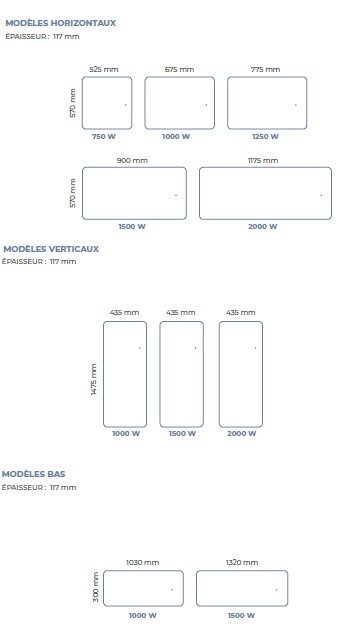 • La gamme DOOK se décline en 3 formats: : horizontal (57cm de hauteur), vertical (faible largeur) et bas (hauteur de 30cm): ultra-compact, axoo vous permettra d’occuper intelligemment les espaces disponibles. Vous pourrez ainsi équiper l’ensemble de votre habitation tout en faisant face à vos contraintes d’espace et d’aménagement mais en gardant une unité de technologie de chauffe, de performance et de design.